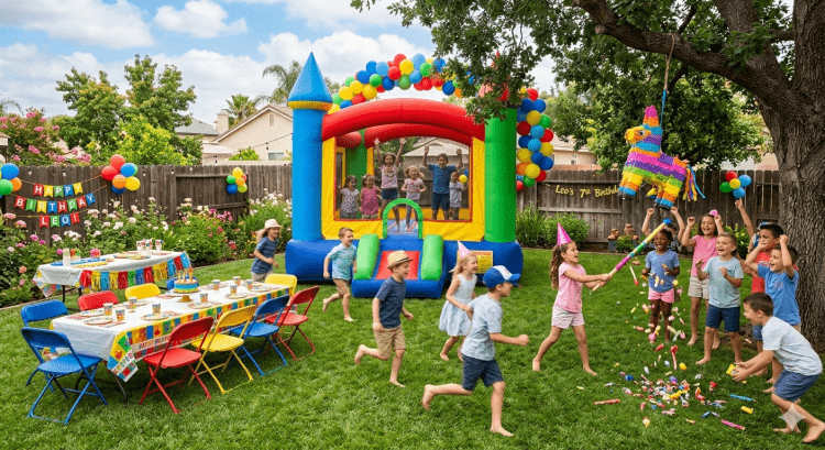This package includes a colorful 13x13 multicolor bounce castle so kids can jump and play while guests relax. We also provide 2 tables and 12 chairs rentals, plus free delivery within 10 miles of zip code 92562, making party planning simple and stress-free.
